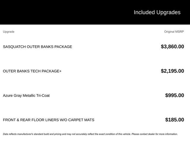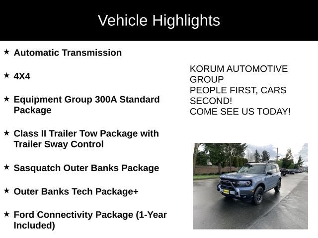 Automatic Transmission, 4X4, Bronco Sport Outer Banks, 4D Sport Utility, 1.5L EcoBoost, 4WD, Azure Gray Metallic Tri-Coat, Ebony/Roast w/Premium Trimmed Heated Front Sport Contour Bucket Seats, 12.3 Cluster Display, 2 Rear D-Ring Recovery Hooks, 2nd Row Carpeted Seatback, 400W Pro Power Onboard, AM/FM Stereo, Auxiliary Switches and Wiring, Class II Trailer Tow Package with Trailer Sway Control, Connected Navigation (1-Year Included), Equipment Group 300A Standard Package, Ford Connectivity Package (1-Year Included), Front and Rear Black Bumpers with Steel Plates, Front Brush Guard with Integrated Recovery Hooks, Front Driver/Passenger Seat Back Map Pockets, High Clearance Fender Flares, HOSS 2.0 Off-Road Suspension, Internet access capable: 5G Modem - Ford Connectivity Package, Outer Banks Tech Package+, Premium Trimmed Heated Front Sport Contour Bucket Seats, Radio: HD w/B&O Sound System by Bang & Olufsen, Rubberized Flooring, Sasquatch Outer Banks Package, SiriusXM with 360L, SYNC 4 with Enhanced Voice Recognition, Trail Control with Trail One-Pedal Drive, Wheels: 17 Ebony Black-Painted Aluminum, Wheels: 18 Ebony Black.