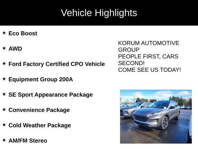 Certified. Eco Boost, AWD, Ford Factory Certified CPO Vehicle, Ford Escape SE, 4D Sport Utility, 1.5L EcoBoost, 8-Speed Automatic, AWD, Carbonized Gray Metallic, Dark Earth Gray w/Unique Cloth Front Bucket Seats, 8-Way Power Driver Seat, ABS brakes, AM/FM Stereo, Black Front & Rear Bumpers, Black Upper Window Molding w/Black Beltline Molding, Cold Weather Package, Convenience Package, Dual-Zone Electronic Automatic Temperature Control, Electronic Automatic Temperature Control (EATC), Equipment Group 200A, Exterior Parking Camera Rear, Fold-Down Rear Center Armrest w/2 Cupholders, FordPass Connect, Gloss Black 5-Bar Upper Grille w/Chrome Surround, Halogen Projector Headlamps w/LED Signature, Heated & Premium Wrapped Steering Wheel, Heated Front Row Seats, Heated Sideview Mirrors, High Gloss Black Mirror Skull Caps, Power Liftgate, Remote Start System w/86C, SE Sport Appearance Package, SYNC 3 Communications & Entertainment System, Traction control, Wheels: 19 Machined-Face Ebony-Painted Aluminum. 26/31 City/Highway MPG