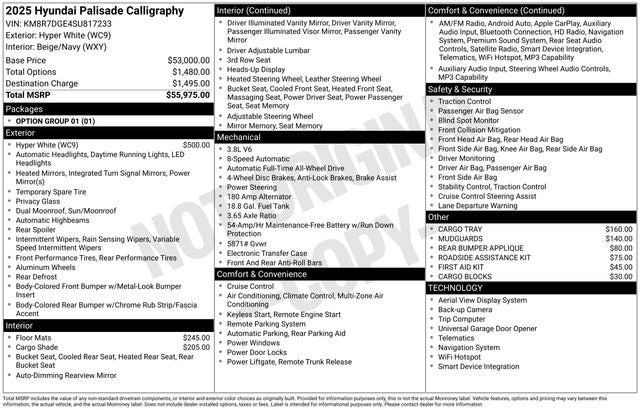 Certified. Leather, Hyundai Factory Certified CPO Vehicle, Panoramic Roof, AWD, Hyundai Palisade Calligraphy, 4D Sport Utility, V6, 8-Speed Automatic with SHIFTRONIC, AWD, Hyper White, Beige/Navy Leather, ABS brakes, Apple CarPlay & Android Auto, Exterior Parking Camera Rear, Front dual zone A/C, Heads-Up Display, Memory seat, Navigation System, Option Group 01, Power Liftgate, Power moonroof, Radio: AM/FM/MP3 Premium Audio System, Rear air conditioning, Traction control.